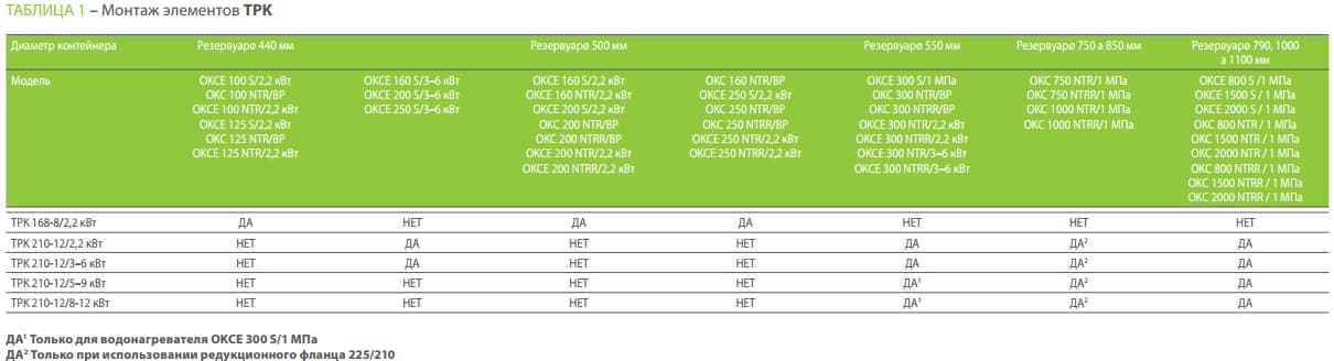 - ?210 мм водонагревателей OKC 800, 1500, 2000 NTR/10 Бар, OKC 800, 1500, 2000 NTRR/10 Бар, OKCE 300, 800, 1500, 2000 S/10 Бар –TPK 210-12/3-6 кВт, TPK 210-12/8-12 кВт, TPK 210-12/5-9 кВт и TPK 210-12/8-12 кВт.